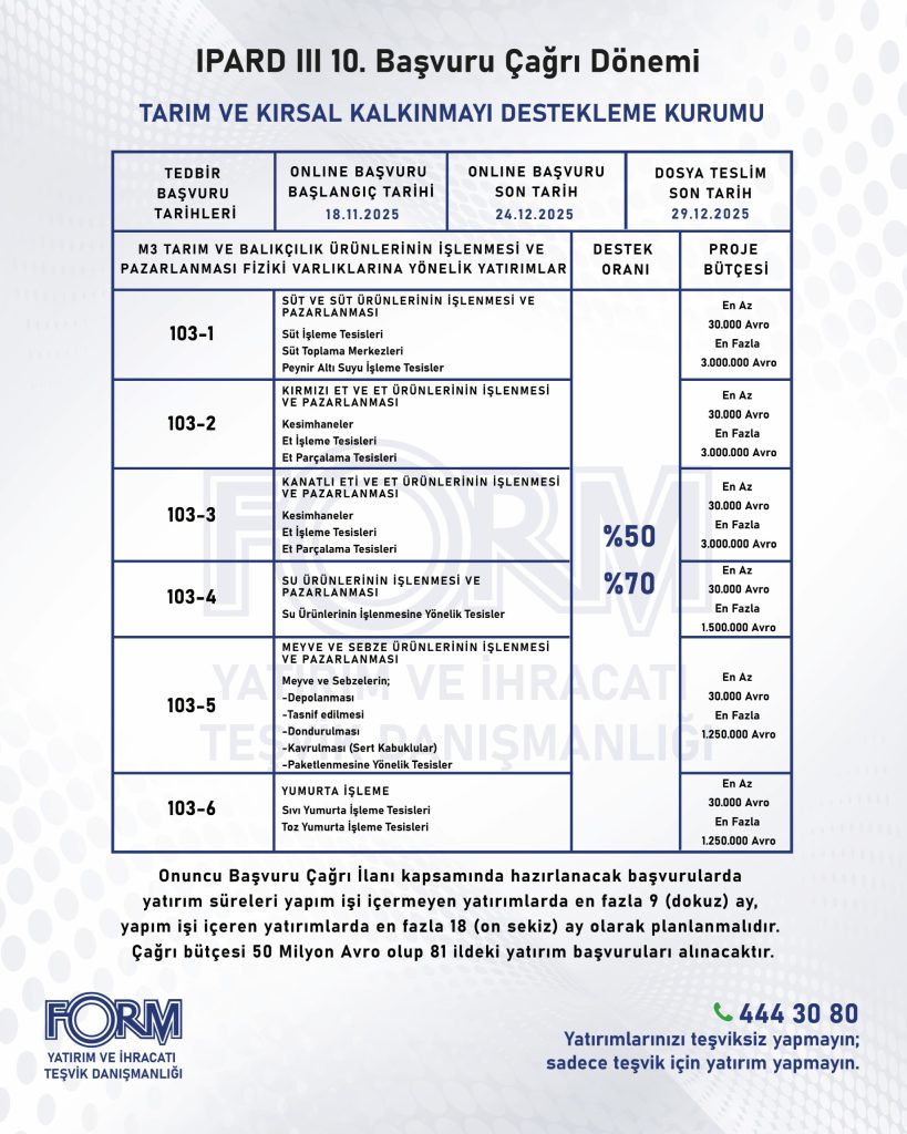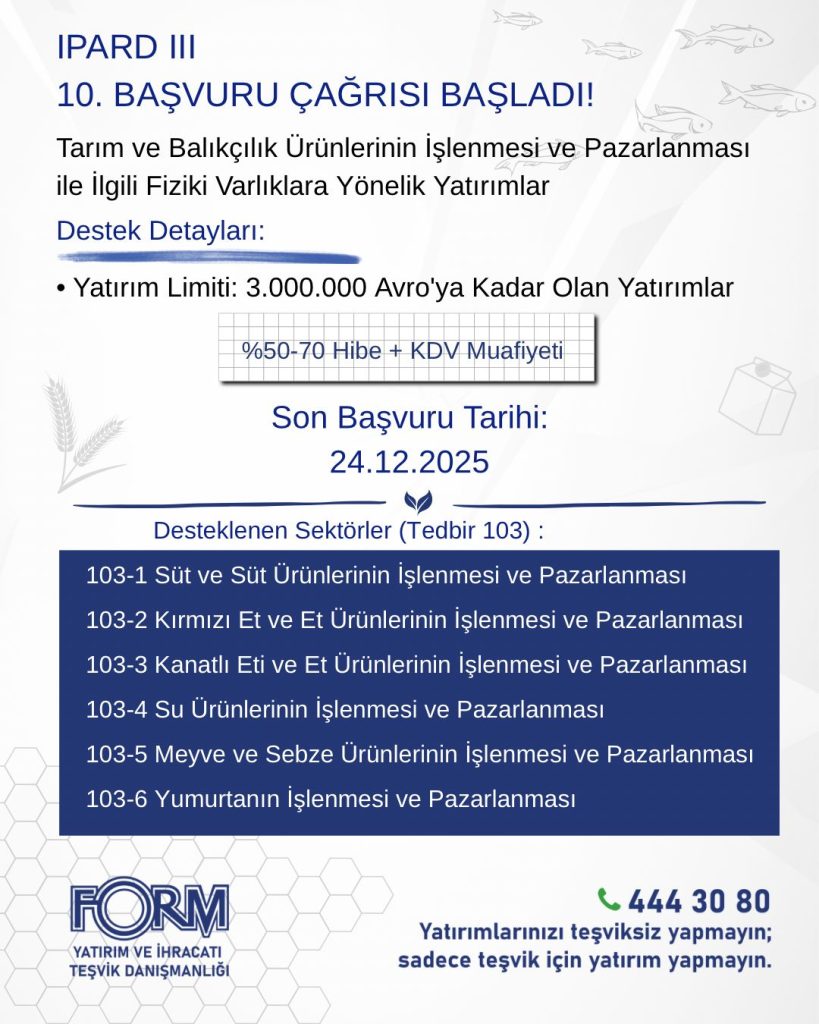 Tarım ve Kırsal Kalkınmayı Destekleme Kurumu (TKDK) tarafından yürütülen IPARD III Programı kapsamında, 10. Başvuru Çağrısı yayımlandı.